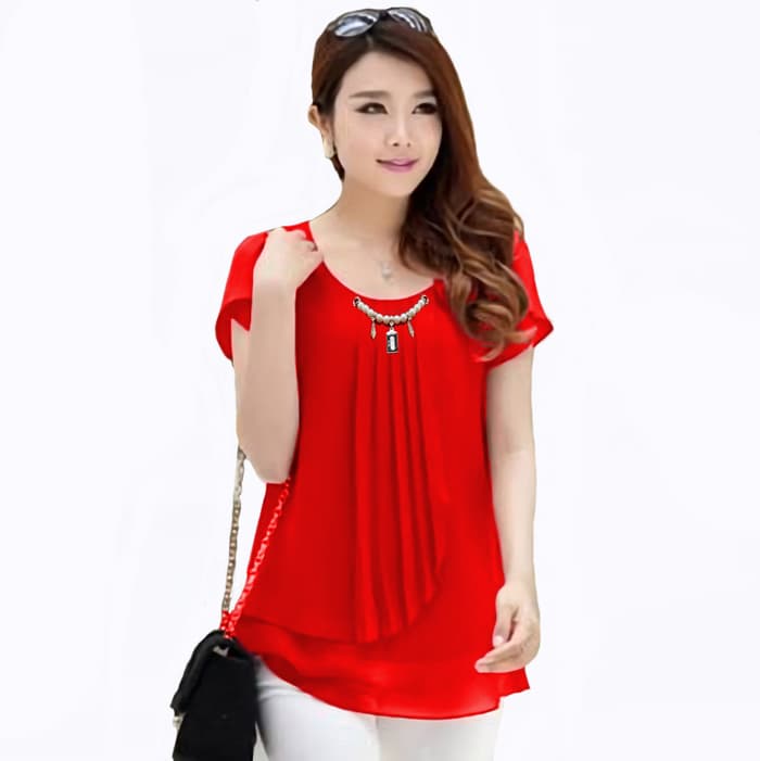 Fashion blouse sifon tangan pendek gaya korea. Terbuat dari bahan sifon berkualitas, di lapis kaos spandek bermutu di bagian dalam, nyaman di pakai. Model simpel dan elegan,dengan variasi kalung mutiara di bagian leher, di pasang menggunakan peniti, sehingga bisa di lepas, cocok untuk berbagai acara.